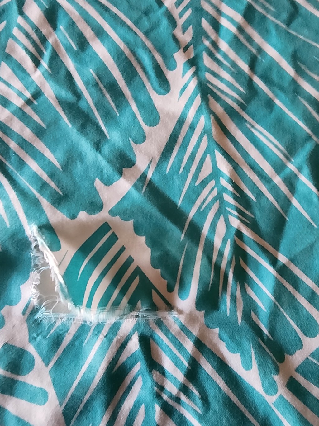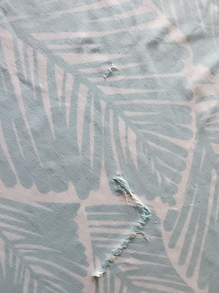 To begin you want to iron the item and line up the edges to be joined up as closely as possible. The alignment can be approximate for non-visible items. As you can see in the picture, the ripped edges of the sheets were frayed but easily aligned when ironed. Once you are happy with the alignment, trim the patch to fit the edges with a sufficient excess to ensure that there is fabric to adhere to that is not frayed or previously damaged.